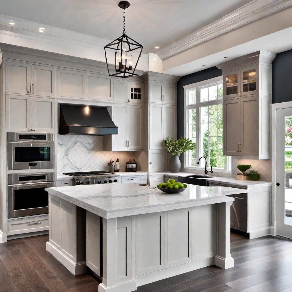 Step into a world where Classic Elements meet Modern Luxury Kitchen Design. The ornate crown molding adds a touch of sophistication, reminiscent of Luxury Mansions Interior. The elegant chandeliers hanging above illuminate the space, creating a warm and inviting atmosphere in this Modern Luxury Kitchen.