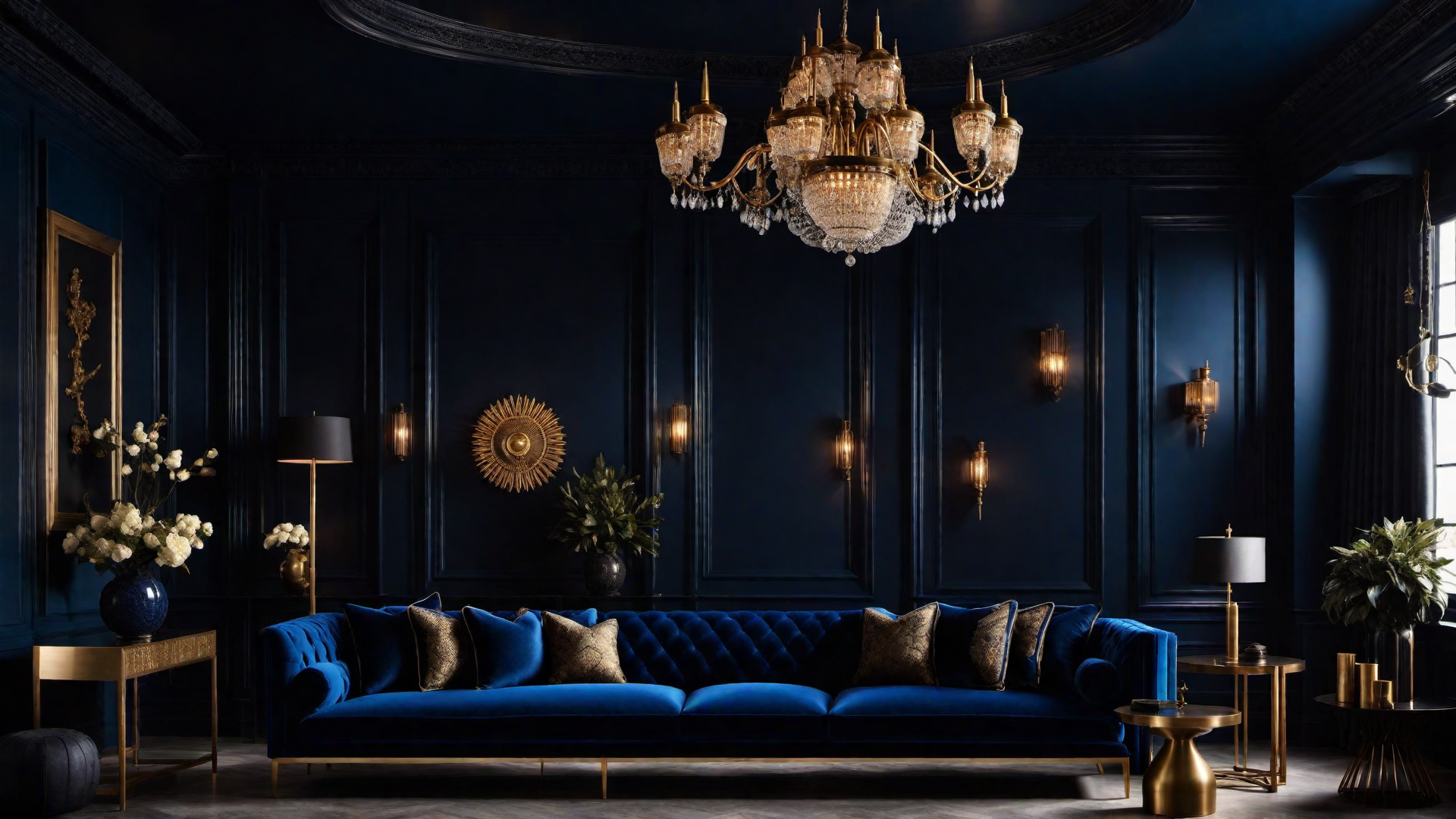 Step into this moody home decor living room where elegance meets darkness. The dimly lit room exudes a sense of mystery and sophistication, creating an atmosphere that is both cozy and eclectic. The contrasting black and deep blue velvet furniture adds depth and richness to the space, while the dimmed antique brass lighting fixtures cast dramatic shadows, enhancing the overall ambiance.